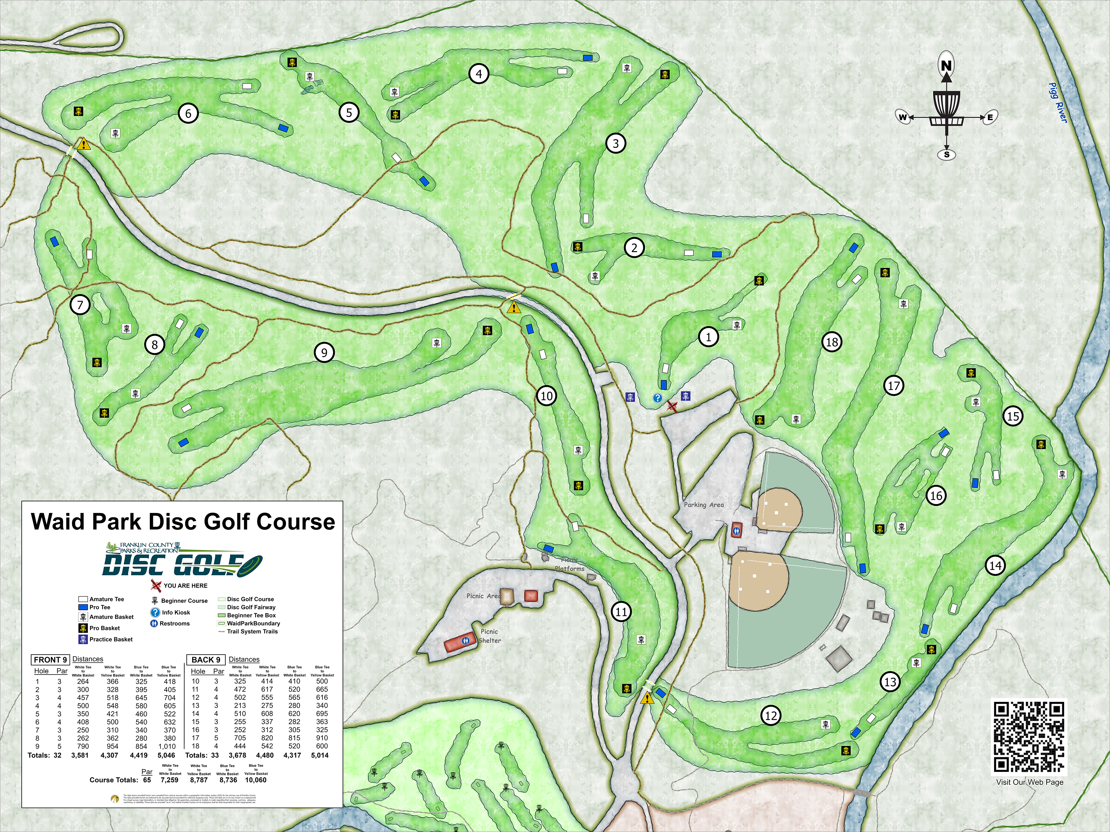 The Waid Park 18-hole course has 36 baskets, 36 turf tee pads and two practice baskets. This challenging pro level wooded course was constructed in 2022. The course would not be possible without the generous donations from these founding sponsors.